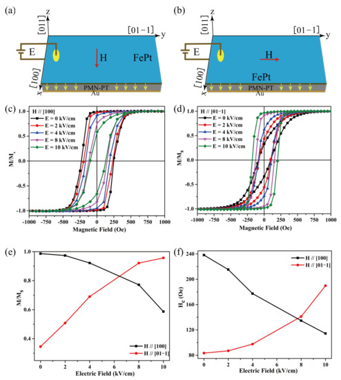 Schematic images for M–H loops measured under electric fields along the [100] direction (a) and [01−1] directions (b), respectively; the M–H loops measured under different electric fields along the [100] (c) and [01−1] (d) directions, respectively; electric-field controlled Mr and Hc along the [100] (e) and [01−1] (f) directions, respectively.