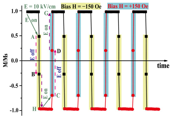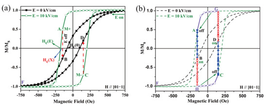 According to the earlier reports, the electric-field-induced magnetization reversal can be realized in the FePt film with the change of electric fields due to the variation of Hc [39,40]. We take the magnetization curve along [01−1] direction as an example to demonstrate this reversal process. First, the FePt/PMN-PT/Au is magnetized by a saturation magnetic field (750 Oe) along the [01−1] direction with an electric field applied on the substrate. Then, the magnetic field gradually reduces and goes through zero to a negative field Hc(X) = 150 Oe, which locates between Hc(0) and Hc(E). If the applied electric field is removed at this time, the magnetization of FePt film would correspondingly drop from point A to point B and accompany with the change in sign of magnetization from +M to −M due to the different magnetization states under the electric fields of 10 kV/cm and 0 kV/cm [38,39,40]. It is worth noting that the magnetization vector is not fully reversed at this condition, which results in a relatively small signal-to-noise ratio. Now, if the magnetic field is switched off to 0 Oe, the sign of magnetization vector cannot be changed. In order to realize the reversible magnetization reversal, based on the earlier reports [39,40], the FePt film should be magnetized under a reverse saturation magnetic field, which corresponds to the movement from B to F. The switching back of magnetization from C to D can be achieved by analogous method, which is shown in detail in Figure 3a. Based on this mechanism, a relatively large saturation magnetic field is required to realize the reversible magnetization reversal [38,39,40].