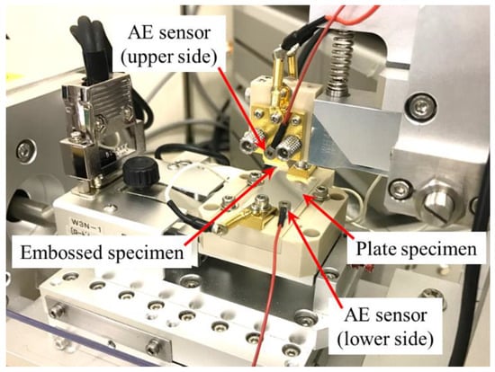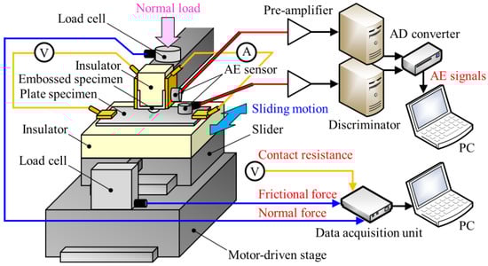 Figure 1 shows the appearance of our test equipment and Figure 2 is a schematic representation of the pin-on-plate type reciprocating sliding tester that we used in this study. With this tester, the normal force and frictional force were measured by using load cells. At the same time, the contact electrical resistance between the two specimens was measured by the four-terminal method at an applied constant current of 10 mA. The experiments were conducted by attaching an embossed specimen to the upper part (pin side) of the tester and attaching a plate specimen to the stage. As shown in Figure 1 and Figure 2, a wideband-type AE sensor was installed on the jig to which the embossed specimen was fixed, and an identical sensor was attached to the plate specimen. An instant glue was used to attach the sensors. The optimal positions for attaching the AE sensors to the two specimens were determined by means of a preliminary experiment in which the AE signal amplitudes at various positions were compared. Table 1 shows the AE measurement conditions. The output signals from the two AE sensors were amplified with an amplification factor of 90 dB and were passed through a high-pass filter (50 kHz or 100 kHz) to eliminate noise. The AE signals were evaluated in terms of the AE mean amplitude, i.e., the amplitude of the voltage signal after passage through half-wave rectification, an enveloping process, and an averaging process with a discriminator after the filter.