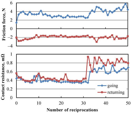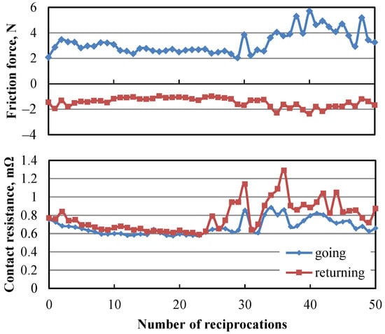 First of all, we will give an overview of the series of wear processes of the silver-plating layer as identified by the friction and wear experiments. Figure 3 shows the changes in the frictional force and the corresponding contact electrical resistance for an experiment involving 50 reciprocation cycles for specimens with a silver-plating thickness of 1 µm. The average one-way sliding period for the frictional force and the contact electrical resistance were calculated and plotted as “going” and “returning” data. Here, it is inferred that the difference between the frictional force values for the “going” and “returning” strokes was the result of differences in the rigidity of the embossed specimen fixing arm. The frictional force temporarily increased immediately after the start of sliding, and then decreased gradually through a running-in process. The frictional force subsequently increased at about the 30th reciprocation. The contact electrical resistance also initially decreased due to the effect of the running-in process, but then increased from the 25th reciprocation, before the frictional force increased.