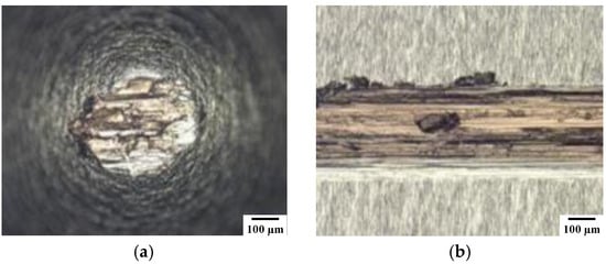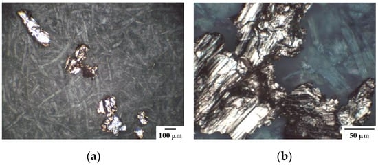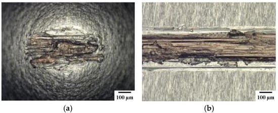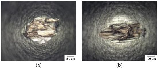 Figure 4 shows micrographs of the worn surface of both specimens after 50 reciprocation cycles. The surface was found to be roughened due to adhesion and the presence of residues of transfer particles, and it can be seen that the copper of the substrate was exposed in both specimens. During the experiment, metallic-colored severe-wear particles, as shown in Figure 5, were also observed. An enlarged image of the surface of the wear particles (Figure 5b) showed the presence of both copper and silver-colored parts. These particles were therefore generated through a mutual transfer-and-growth process due to adhesive wear [,].