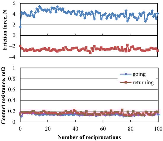 Changes in the frictional force and the contact electrical resistance (t = 0.2 mm, Ag plating 1 µm, v = 200 mm/min).
