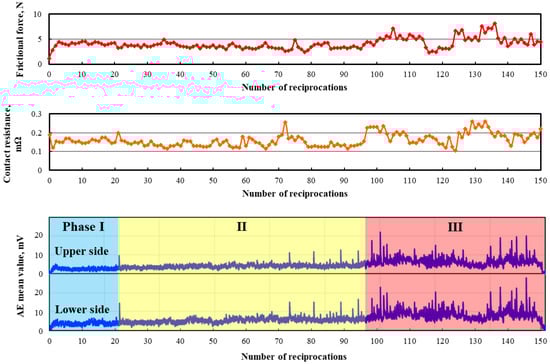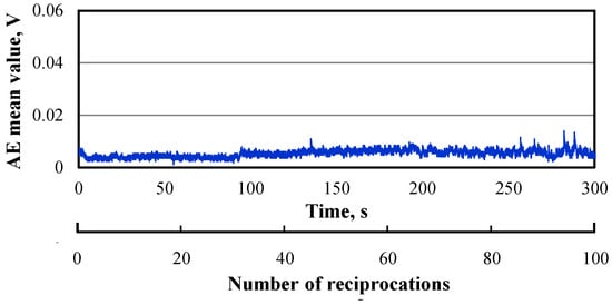 The transition point at around the 30th reciprocation, as shown in Figure 9, corresponds to the time position of 100 s in Figure 10. Therefore, the contact electrical resistance tends to change after the AE signal has changed. This is because AE sensing can capture microscopic wear processes. Even in experiments under different sliding conditions of normal load and sliding velocity, it was confirmed that the contact electrical resistance tended to increase after the burst-type AE signal was temporarily activated. This change in the AE mean value is considered to have corresponded to activation of the burst-type AE signal due to the mutual transfer-and-growth process, and the decrease was due to the detachment of transfer particles [].