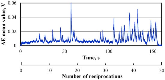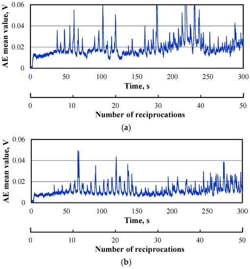 In this section, changes in the AE signal for the embossed-specimen side are described and two typical sets of results obtained from sliding experiments with 50 reciprocations with a silver-plating thickness of 1 µm are presented. The changes in the frictional force and the contact electrical resistance were almost the same as those in Figure 3 and Figure 9, so they are omitted. Figure 12 shows the changes in the AE mean value as measured by the AE sensor for the embossed-specimen side. The difference in the AE signal level between these two experimental results is considered to have arisen from differences in the progress of wear.