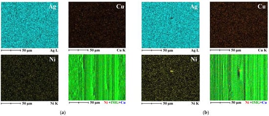 To clarify the differences between the various phases, the experiment was stopped at the beginning of Phase I and Phase II, and the wear surface was analyzed by energy-dispersive X-ray spectroscopy (EDS) (Figure 15). From the result of the elemental mapping shown in Figure 15a, it can be seen that the outermost surface in Phase I consisted entirely of silver. On the other hand, when the experiment was stopped at the beginning of Phase II, nickel of the intermediate plating was present on microscopic areas, as shown in Figure 15b. Therefore, the burst-type AE signal that was detected was caused by material transfer in adhesive wear. Because the test was stopped when a large burst-type AE signal was detected from the plate specimen side at an early stage of Phase II, the AE signal was detected when the material was transferred from the plate specimen to the embossed specimen.