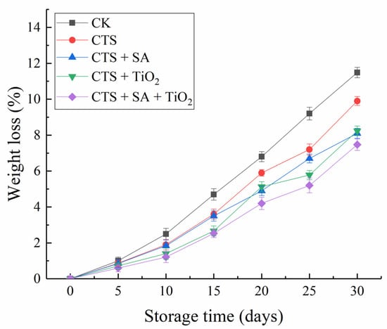 In this study, all the treatments using chitosan, both alone and in combination, were found to be highly effective in minimizing the weight loss of blackcurrant fruit during storage at 4 °C, compared to CK (Figure 1). Irrespective of treatments, however, weight loss increased progressively with the advancement of storage to 30 days. Of the five different treatments, the maximum weight loss (11.49%) was recorded in CK fruits, significantly higher than other treatment groups (p < 0.05), followed by the CTS (9.90%), CTS + TiO2 (8.24%), and CTS + SA (8.10%) groups of blackcurrants. The fruit treated with CTS + SA + TiO2 showed the least weight loss (7.47%) at the end of the full storage period (p < 0.05).
