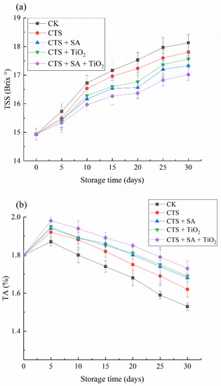 A high TA content could be attributed to the chitosan coating’s control over the permeability of CO2 and O2, which could slow the ripening rate of fruits [60] and the substrates for respiration responses, such as organic acids [13]. A reduced rate of respiration in fruits may be reflected in fewer changes in their TA. In this study, the CTS + SA + TiO2 treatment more effectively inhibited the losses of TA in comparison with the other groups, which supports the findings of previous studies that chitosan combined with SA can greatly retain the content of TSS and TA [38]. The link between TA and ripening rate thus warrants closer investigation in future research.