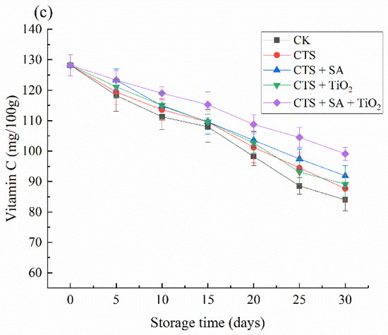 Blackcurrants are an important source of VC, however, much of this essential vitamin is typically lost during storage. According to the investigation of Xing et al. [22] and Xiao et al. [25], the loss of VC is promoted by the presence of O2 and CO2, but chitosan coatings can control the permeability of CO2 and O2 content in the microenvironment and further slow the rate of maturation. This explains the rapid decline of VC content in this study’s CK group. As a water-soluble antioxidant, VC directly decreases the damage from reactive oxygen species (ROS) [61]. At the end of the storage period, the CTS + SA + TiO2 group was found to have the highest VC content, concurring with the results of Huang et al. [62], Sayyari et al. [63] and Shi et al. [64], who found that the application of SA in oranges, pomegranates and grapefruit reduced the degradation of VC. Furthermore, according to Shafiee et al. [65], SA could increase VC production by increasing the activity of ascorbate peroxidase, which effectively slows the decline of VC. Thus, in addition to the duration and conditions of storage, postharvest treatments also play an important role in VC changes [66].