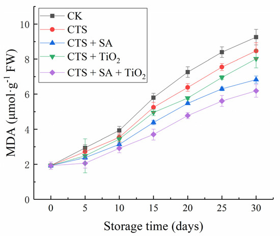 MDA, an important product of membrane lipid peroxidation, has been found to aggravate membrane damage in fruits and vegetables, so its content can indirectly reflect the degree of damage to their tissue and membrane systems [32]. As can be seen in Figure 3, the MDA content in all groups showed a trend of continuous increase during the storage period; however, the rates of increase differed, with the CK group showing the fastest increase and reaching 9.25 μmol/g by the 30th day (p < 0.05). By contrast, the CTS + SA + TiO2 group showed the slowest growth of only 6.19 μmol/g MDA content in the same period (p < 0.05). The final levels of the other three treatment groups were 8.47 μmol/g (CTS), 8.02 μmol/g (CTS + TiO2), and 6.83 μmol/g (CTS + SA), indicating that both chitosan and chitosan composite coatings can inhibit the production of MDA (p < 0.05).