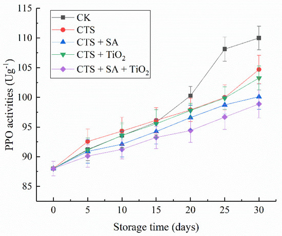 The PPO activities in blackcurrant fruits treated by different coatings during storage at 4 °C for 30 days were investigated. The results presented in Figure 4 show the same overall upward trend for all groups, indicating that both CK and coating-treated fruits can increase PPO activity during storage. Of the treatment groups, PPO activity increased fastest in the CK group, reaching 110 U/g by the last day (p < 0.05). The growth rate in the other four groups was relatively gentle, but the CTS group showed the fastest growth, reaching 104.69 U/g by the last day (p < 0.05). At the end of storage, the lowest PPO activity was observed in the CTS + SA + TiO2 group, at only 98.88 U/g (p < 0.05).