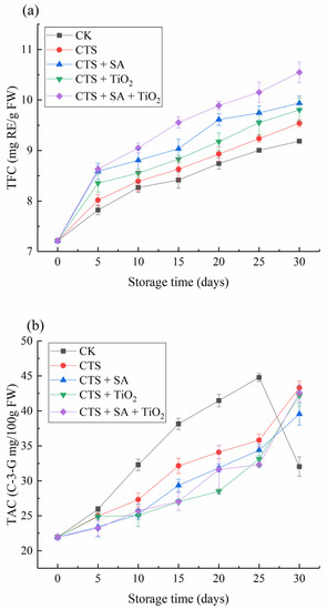 In this study, the fruits treated with the chitosan and chitosan composite coatings showed higher retention of TFC during the entire period of storage. Furthermore, the film with chitosan, combined with SA and CTS + SA + TiO2, performed best. The CTS + SA coated blackcurrants retained more flavonoids than other treatments, as the semipermeable coating of chitosan restricted moisture loss, gas exchange and senescence by modifying endogenous O2 and CO2 [69]. A reduced loss of TFC in response to pre-storage SA treatment was similarly reported in litchi [45], and chitosan was also reported to be highly effective in retaining higher TFC in treated grapes than the control [73]. On the other hand, these TFC and TAC might also be due to TiO2 nanoparticles, which are able to delay, retard or prevent the oxidation processes of flavonoids and anthocyanins by reacting with free radicals, chelating metals and acting as oxygen scavengers [40,74].