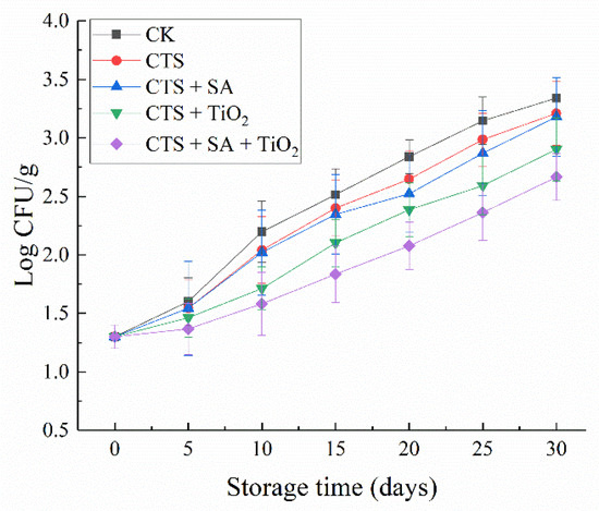 The quality of blackcurrants during storage is limited by the highly perishable nature of the fruit, including susceptibility to postharvest diseases associated with bacteria, yeasts and fungal infection [8]. The number of pathogenic colonies is, thus, a critical index to the quality of blackcurrants during storage. Figure 6 shows the effects of different chitosan treatments on the total viable counts in blackcurrants during storage. A total aerobic plate count showed that the total number of aerobic mesophilic microorganisms in all the samples was below the detection limit of 2.0 × 101 CFU/g on day 0. The colony number in the CK group was higher than those of the other four groups throughout storage, finally measuring 3.34 log CFU/g on the last day (p < 0.05), while the conditions of the other four groups were as follows: CTS (3.20 log CFU/g), CTS + SA (3.18 log CFU/g), CTS + TiO2 (2.90 log CFU/g) and CTS + SA + TiO2 (2.67 log CFU/g).