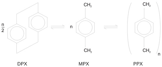 - Franz, G.; Schamberger, F. Evaporation and thermal cracking of dimeric parylenes. J. Vac. Sci. Technol. 2013, 31, 061602. [Google Scholar] [CrossRef]