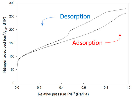 The obtained isotherm (Figure 7) shows a Type IV(a) isotherm [14], which indicates the presence of a mesoporous structure with gas condensation in some pores. Additionally, a hysteresis Type H4 is observed, which is associated with the filling of micropores. This is in accordance with the results from the pore distribution shown in Figure 6.