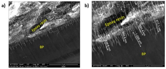 To have a better understanding of the physical interfacial interactions, SEM images of the interface formed between the BP and all four coatings were taken at different magnifications. Since variable pressure on the SEM was not available, the problem of charging affected the quality of the SEM images. The epoxy resin was the most interesting (Figure 10): a maximum penetration of 1 µm into the BP was observed (3.2% thickness infiltration). The higher wettability helped it to get into the pores. However, the more the epoxy penetrates, the more it can affect conductivity. This image also shows that pores inside the BP could have more of a cylindrical shape than a spherical one. Using the average pore size and the distance between six selected pores (35.4 nm average diameter) from Figure 10 and considering a linear approach, porosity results in 45.3%. This porosity is higher than the one calculated from the DFT (30.45%), probably due to the low number of pores with a pore width higher than 20 nm obtained from that method.