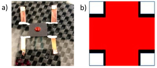 For an even coating, three drops of the coating were deposited in the center of the sample (Figure 11a) and then spread with a razor in a cross pattern (Figure 11b), leaving the corners uncoated. Three uncoated buckypapers were used as control samples.