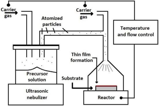There are some deposition techniques to obtain SnS thin film such as chemical bath [,,], chemical solution process [], radiofrequency sputtering [,], vacuum evaporation [], and spray pyrolysis (SP) [,,]. In particular, Ultrasonic Spray Pyrolysis (USP) is one of the simplest techniques due to its relatively cheap implementation, since it does not require a vacuum. Moreover, this technique can be scaled for large areas of deposition. In the USP technique, a precursor solution is atomized, then with a carrier gas (e.g., nitrogen), the atomized solution is driven towards the substrate until it forms a thin film [].