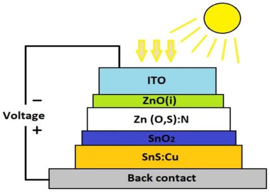 Numerical simulation is a useful tool to predict the effect of changes in material properties inside a device and optimize the structure of cells. The advantage of simulation is to evaluate the performance of a system, existing or proposed, under different configurations of interest, reducing the time and cost of construction and characterization. SCAPS software can be calibrated with experimental results and can be explored to design various high-efficiency solar cells with arbitrary device dimensions/design parameters []. There are previous investigations on simulation of solar cells based on common photovoltaic materials such as silicon (Si) or cadmium telluride (CdTe) using the SCAPS software (version 3.2.01 and version 3.3.05 respectively) [,], there is even a study of the simulation of tin sulfide (SnS)-based solar cell using SCAPS []. However, for the research presented here, the simulation of a solar cell using SCAPS (version 3.3.10) based on SnS:Cu obtained by USP as an absorbing material is not addressed. To have a visual image of the all materials in the structure that accompanies the copper-doped tin sulfide thin film, Figure 2 shows the diagram of the solar cell structure, where the parameters of the other materials are based on Minbashi et al. and Sinsermsuksakul et al. [,].