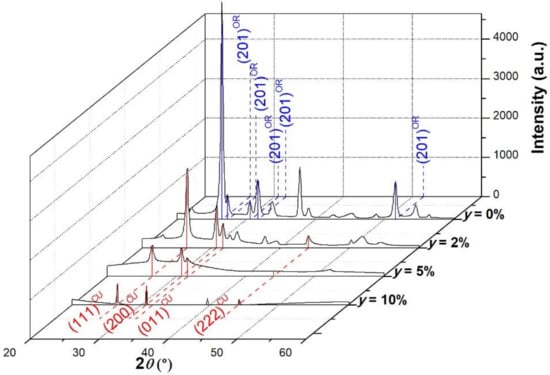 XRD patterns of the undoped and Cu-doped SnS films are shown in Figure 3. Each diffractogram shows its correspondent copper concentration ratio y. As discussed in [], the peak positions highlighted by the blue dashed lines in the figure found in the diffractogram of y = 0% perfectly fit a crystal lattice with an orthorhombic structure (OR) (card no. 01-071-3681). In turn, the peaks highlighted by the red dashed lines found for the diffractograms 2%, 5%, and 10% correspond to cubic crystal (CU) (card no. 01-077-3356).