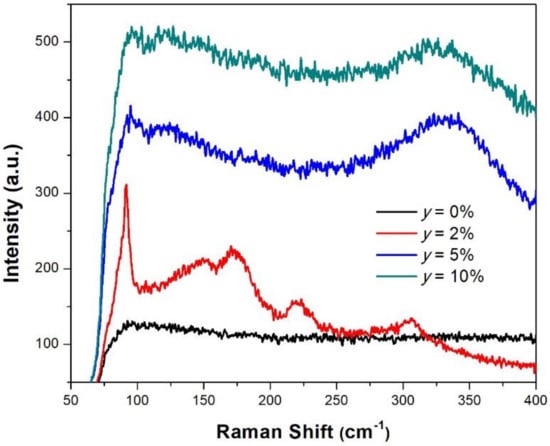 It is also possible to observe in Figure 6a that the spectrum with the minimal percent of transmittance is from the 2% doped thin film, with a shape more homogeneous dependence on the wavelength at the interval λ > 400 nm. On the other hand, shoulders to the spectra at y = 5% and 10% are observed, which indicates the presence of different phases in the layers [].
