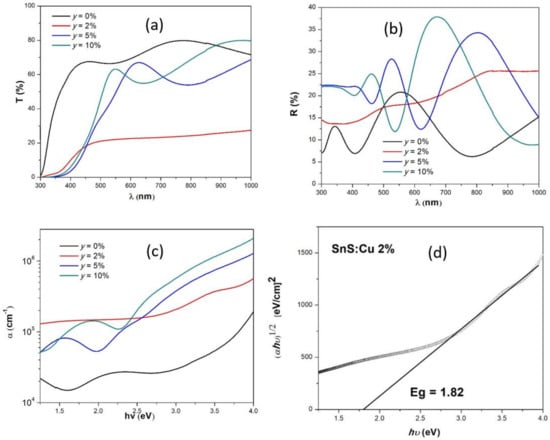 Transmittance (a) and reflectance (b) spectra of the SnS:Cu thin films, calculated α (c) and Tauc method for sample y = 2% (d) []. Copyright permission from: IEEE.