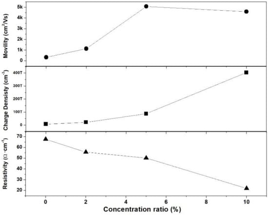 In Figure 7, mobility, carrier concentration, and resistivity obtained by the Hall–Van der Pauw technique are shown as a function of the copper concentration of SnS:Cu thin films []. All of the films are found to exhibit p-type natures, indicated by a positive Hall voltage. On increasing the doping concentration, parameters like carrier concentration and hole mobility tend to increase. For the particular case of mobility, grain boundaries act as scattering centers, then, due to small crystallite distributed randomly, carriers have to travel multiple grain boundaries, resulting in low mobility. Then, it is likely that a better distribution of small crystallite, in the deposited films, is the main reason for the increase in mobility of charge carriers. Therefore, films with greater homogeneity on crystallite distribution can show more mobility with respect to films with lesser homogeneity. The results of GLCM from SEM investigation, in Table 3, can confirm the influence of homogeneity on mobility.