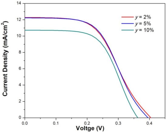 In Figure 8, it is possible to observe differences in the curves J–V for each y value, indicating the impact of Cu-concentration on SnS as an absorbent layer into a solar cell structure. Functional parameters such as open-circuit voltage (Voc), short-circuit current density (Jsc), filling factor (FF), and efficiency (η) contained in Table 6 show an increase up to y = 5% in the sample. This behavior may be due to the increase in absorption coefficient and the mobility on type-p charges observed in Section 3.5 and their effect inside the simulated solar cell. The case of the observed drop in these parameters of the y = 10% sample would probably be due to the effect of low thickness shown in Table 4. The thickness absorber plays a significant part in solar cell performance. The thickness of the absorbent layer mainly controls the generation of photo-generated carriers []. It may be possible to further enhance device efficiency by increasing the SnS:Cu absorber layer thickness.