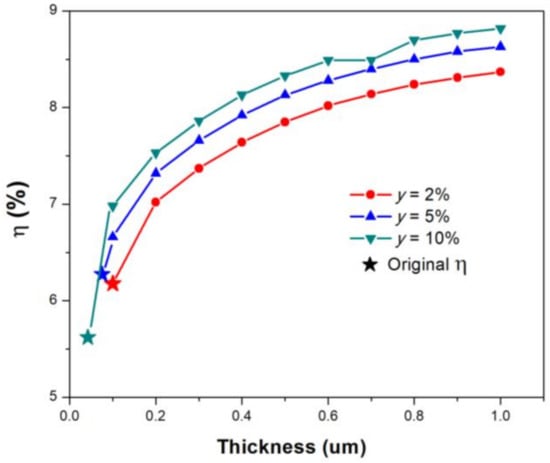 As shown in Figure 9 and Table 7, the increase in the thickness of the SnS:Cu layer provokes efficiency rises of the simulated solar cell for all cases. This can be because an absorbing layer with a higher thickness allows more photons to be absorbed and increases the probability for more electric-generated carriers. The increment of this parameter can lead to optimal performance of the solar cell since the photogenerated currents along with the absorbed photons for longer wavelengths increase, propitiating a better Jsc and Voc [].