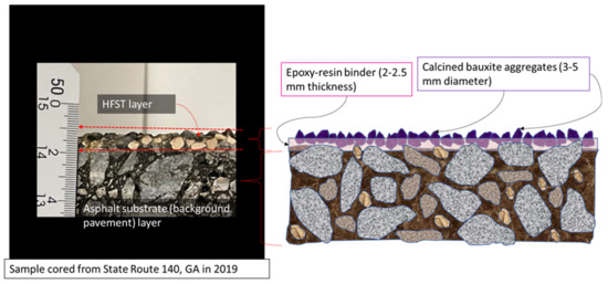 The High Friction Surface (HFS) has been used as one of the low-cost safety countermeasures to address high friction demand concerns on curved roadways. It was developed in the 1960s in the UK by the Greater London Council and the Transport and Road Research Laboratory to restore friction on high-crash road sections [1]. The technology has been adopted in many countries like New-Zealand [2] and the United States [3]. HFS is applied as a thin coating (compared to the thickness of a pavement) on an existing road surface. It is composed of a layer of wear-resistant aggregate like calcined bauxite bonded to the pavement surface with polymer resin binder. Thanks to the high quality and the small size (3–4 mm) of the aggregates, HFS increases the pavement friction value immediately and has proven to significantly reduce roadway departure crashes and wet pavement crashes on horizontal curves and ramps [3]. Figure 1 shows a cross section of pavement installed with the HFS cored out, and it shows the typical dimensions and illustration of HFS.