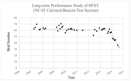 Consequently, this situation causes significant safety concern because transportation agencies cannot reliably predict the friction deterioration and plan for timely actions to mitigate the problem, such as performing a detailed survey, setting up warning signs, replacing pavement, resurfacing pavement, etc. Although, this is not a generalized observation in real-world roadway conditions, the few available data, such as those collected at the NCAT test track, are valuable because they confirm the need to better understand the transition from mild friction decrease (from 2007 to 2014 in Figure 2) to rapid friction decrease within a few months. The transition from a mild evolution of friction deterioration to a rapid deterioration is observable on test tracks, especially at NCAT where the testing can be performed under accelerated pavement testing conditions (more than 50,000 axle passes of load, i.e., 100,000 equivalent single axle loads, every week). Such extremely deteriorated real-world in-service HFST sites are usually replaced by road authorities however, the road authorities also need to take proactive safety and maintenance actions before HFS sections are extremely damaged because it is tied to friction reduction.