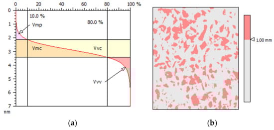 (a) Abbott curve and the volume parameters; (b) projected area (data from MoutainsMap® software).