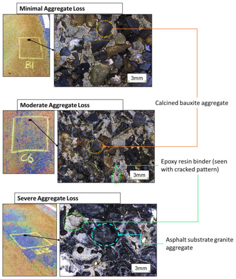 Photos showing example of three different aggregate loss severity types and microscopic image of the corresponding severity type. The photos (left) are enhanced with 400% saturation to distinguish calcined bauxite aggregates (represented as yellow) from epoxy and background asphalt aggregates (represented as green and blue).