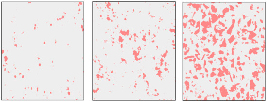 There are many texture parameters, as illustrated by [21]; there is a need to select only parameters that are related to the aggregate loss process and the resulting coefficient of friction. For this purpose, the aggregate-loss failure mode, as described in the background section, is illustrated in Figure 4. Based on the possibility of visually distinguishing surface damages, three deterioration levels are defined (more details in the section “Experimental Set-Up and Data Collection”): minimal, moderate, and severe aggregate loss. For each level, dislocation of aggregates and change in binder are presented.