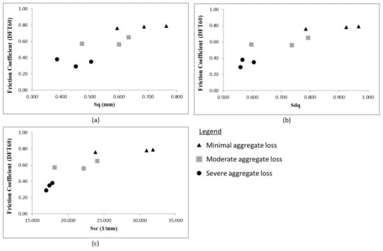 Figure 15 shows the relationship between the aggregate characteristics and the DFT60 friction coefficient. It is seen that the higher the friction, the higher and sharper are the asperities. Therefore, the variation of the asperities’ height (Sq) and angularity (Sdq and Ssc) with the friction coefficient reflects observations made from Figure 13.