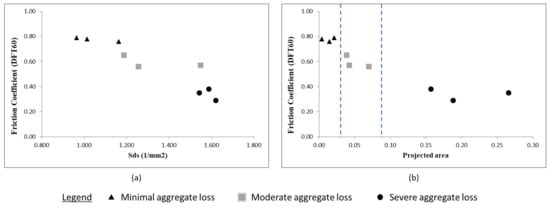 Figure 16 shows the relationship between the aggregate distribution and the DFT60 friction coefficient. Again, the increase of the asperities’ density and projected area reflects the observations made from Figure 14. Furthermore, it seems that the projected area allows separating the three aggregate loss levels (the dotted lines are placed arbitrarily to illustrate the separation); however, the test population is too small, so further validation is needed.