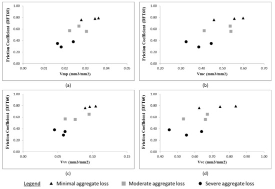 Relationship between DFT60 friction coefficient and volume parameters including (a) peak material volume (Vmp), (b) core material volume (Vmc), (c) valley void volume (Vvv), and (d) core void volume (Vvc).