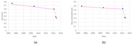 Plot of (a) Sq and (b) Vmc texture parameter values based on an artificial timeline corresponding to friction deterioration.