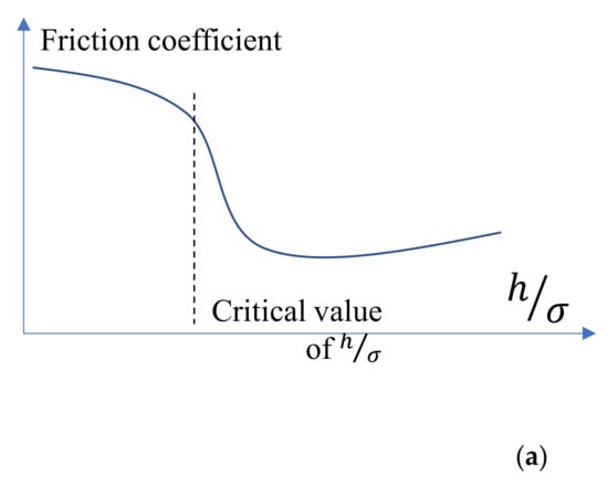 Figure 20b shows a decrease of the coefficient of friction when h/σ increases. A global linear variation can be seen, but one can also expect a S-shaped variation as illustrated by the dotted line drawn “by eye.” Obviously, more data and a more complete modeling are needed to confirm the S-shaped variation. Nevertheless, the coating-inspired approach would provide a way to explain the sudden friction drop (due to a change of “lubrication” regimes) and predict this drop.