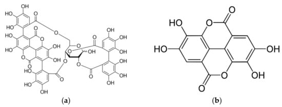 The biopolymers based edible coating could control the oxidation and migration processes of horticulture produce and give good protection of nutritional content, microbial safety and postharvest characteristics (shelf life, appearance, color, flavor, aroma, moisture loss, etc.) during the storage period [20,21]. Recently, the interest in incorporating natural antioxidant agents within the biopolymers to develop edible coatings and films has been increased. In this context, incorporation of pomegranate peel extract as a natural antioxidant agent into the edible coating formulation can enhance the inhibition rate against loss of vitamins, enzymatic reaction, oxidation and browning of produces due to its excellent properties and phenolic compounds [22,23]. Pomegranate peel is considered an important source of phenolic compounds such as gallic acid, ellagic acid, punicalagin A, punicalagin B and other tannins (Figure 1). This study aimed to evaluate the effect of chitosan–pullulan (50:50) composite edible coating enhanced with pomegranate peel extract on postharvest physicochemical characteristics of Safeda mango at room (23 °C, RH-45%) and cold (4 °C, RH-95%) temperature conditions throughout the storage period for 18 days.
