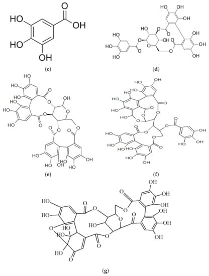 Chemical structure of major bioactive components of pomegranate peel extract: (a) Punicalagin; (b) Ellagic acid; (c) Gallic acid; (d) Corilagin; (e) Pendunculagin; (f) Casuarinin; (g) Granatin A.