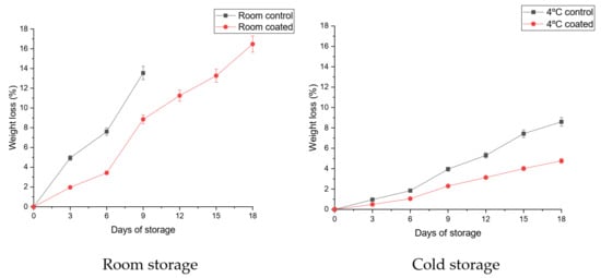 The physiological mass loss of the fruits happens due to the water transpiration during the storage period [35]. Chitosan–pullulan composite edible coating with pomegranate peel extract significantly reduced the mass loss of mango fruits at room temperature and cold temperature (4 °C) compared to the control group (Figure 3). The uncoated sample has lower quality at room temperature than the coated samples after 9 days of storage at laboratory temperature. The higher physiological mass (weight) loss at room temperature could be attributed to a higher respiration rate, leading to higher transpiration compared to coated samples [36]. The PLW at room temperature was 13.54 ± 0.36% for control fruits compared to 8.85 ± 0.12% for coated fruits. During the 18 d storage under cold storage condition, PLW for control was 8.6 ± 0.50%, while coated fruit was 4.76 ± 0.62%. The coated fruits were available for observation for up to 18 d wherein the PLW crossed 10% mark from 12 d onward. The application of the edible coating reduced mango fruit weight loss during storage at room and 4 °C storage conditions. The observed results are supported by the findings of Kumar et al. [9]; Kumar et al. [28]; Kumar et al. [37], who reported the effects of chitosan–pullulan composite edible coating enriched with pomegranate peel extract on litchi, bell pepper and tomatoes. Gol & Rao [38] also found that the application of edible coating controlled the reduction of weight loss in mango fruit during the storage period.