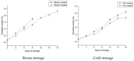 Chitosan–pullulan composite edible coating incorporated with pomegranate peel extract had significantly lower titratable acidity at room and cold temperature (4 °C) compared to control. The results of TA are presented in Figure 5. Acidity was increasing with increase of the duration of storage under both temperature conditions. The acidity increased in control samples during storage at both storage temperatures due to accumulation of organic / malic acids and their conversion as respiratory substrates in glycolysis and TCA cycle [45,46]. On 9 d of storage at room temperature, control samples had higher acidity than coated samples. The acidity increased from 0.17 ± 0.15% (initial) to 1.75 ± 0.02%, which was significantly different. The control samples at room temperature were unacceptable, whereas fruits treated with coating were in a marketable condition. The maximum and significantly increased titratable acidity was recorded in control mango storage at room temperature. After 9 d of storage, the acidity at room temperature was observed at 1.75 ± 0.02% compared to 1.30 ± 0.15% in coated fruits, which was significantly lower compared to the control.