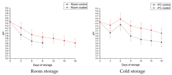 The pH represents the nature (acid/base) of the fruits & vegetables. The pH of the fruits and vegetables usually decreases with the storage time due to increase of acidity, respiration rate and delayed utilization of organic compounds. The trends of pH change in tested mango fruits are presented in Figure 6. Chitosan–pullulan composite edible coating with incorporated extract of pomegranate peel significantly controls the decreasing pH at room temperature and cold temperature (4 °C) compared to control.