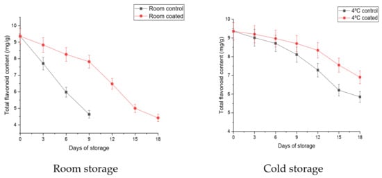 Flavonoids (C6-C3-C6) are natural water-soluble pigments and are complex phenolics that indicate the ripening stage of fruits [67,68]. Chitosan–pullulan composite edible coating incorporated with pomegranate peel extract significantly controlled the decreasing flavonoid content activity of mango fruits at room and 4 °C temperatures compared to control. The flavonoid content of the mango fruits was decreased with increasing time of storage period at both room temperature and cold storage temperature conditions in control and coated. The results of the total flavonoid content of mango fruits are presented in Figure 9. The results showed a decreasing trend of flavonoid content activity in mangoes at both storage conditions. At room temperature, mangoes could be stored for 9 d as control samples significantly reduced the total flavonoid content compared to coated samples. The decrease in flavonoid content in control may be due to its higher respiration rate, which causes total phenols to be broken down [69]. The statistically significant and higher loss of flavonoid content was recorded in control mango storage at room temperature.