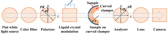 To measure and analyze the curved-mechanical characteristics of transparent conductive film-coated polymer substrates, this study develops a common-path optical interferometric technique to measure the phase retardations of a sample on a curved clamper, as shown in Figure 1. The light from a flat white light source passes through a color filter and a PR polarizer and is thus transformed into a linearly polarized light at 45° to the y axis. The light next passes through a liquid crystal modulation and a tested sample on a curved clamper with an r radius of curvature. The light then passes through an AR analyzer with a transmission axis at −45° to the y axis, and finally through an imaging lens and camera to obtain the phase retardations of the sample during curving. Because the collimated light transmitted to the transparent curved test sample causes refraction and phase retardation, this study derives the phase retardation influence factor in curving. The phase retardation under the curving of the test sample is next measured using common-path optical interferometry. Finally, the phase retardation influence factor in curving is subtracted from it, and the phase retardation of the sample in curving is obtained.