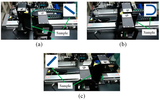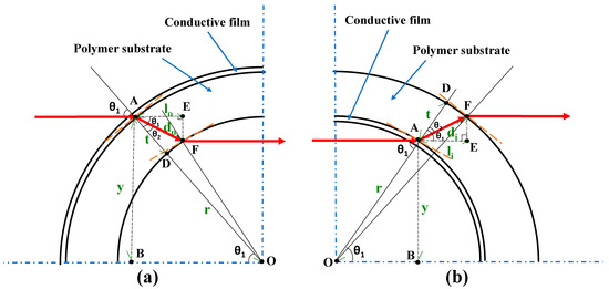 Because the thickness of the transparent conductive film of the test sample is much lower than that of the polymer substrate, this study considers only the refraction effect of the polymer substrate under curving, as shown in Figure 2. Figure 2a,b shows the optical paths of the test sample of the collimated light source transmission under outer and inner curves.