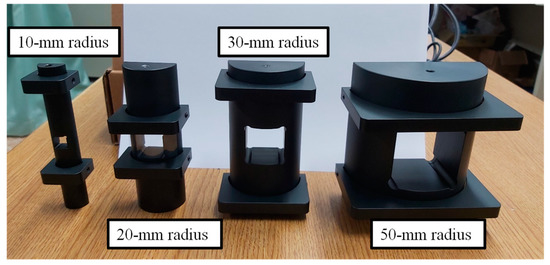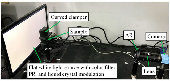 Figure 3 depicts the instrument configuration of the phase retardation measurements of the test sample under a curving with a 30-mm radius by common-path optical interferometry. To avoid light interference, this study measured the phase retardation of the sample in a dark room. In this study, a flat white light source with a color filter, PR, and liquid crystal modulation was used as a linearly polarized white light with a 535.38-nm central wavelength; this was a liquid crystal flat panel display. This study also utilized a 1388 × 1038-pixel camera (Basler/A631fc) with an AR analyzer in front to capture phase retardation images. Finally, liquid crystal modulation was controlled to perform four-step phase shifting [46] for 0, 1/6, 1/3, and 1/2 maximum intensities, image processing, and correction calculations, which was necessary to measure the optical retardation images under the curving of the test sample using LabVIEW software. Each phase retardation measurement was the average value of 15 measurement images. In this study, four curved clampers with radii of 10, 20, 30, and 50 mm were used to provide four corresponding curving conditions of the test sample, as shown in Figure 4. In addition, each curved clamper had a measurement area of 10 × 10 mm or greater. Figure 5 depicts a 125-μm-thick PET substrate and 80-, 160-, and 230-nm ITO films coated on 40 × 40 mm 125-μm-thick PET substrates (VisionTek Systems Ltd., Chester, UK). Monolayer graphene films coated on 40 × 40 mm 250-μm-thick PET substrates (Graphenea Inc., Cambridge, MA, USA) were utilized for curved-mechanical characteristic measurements in this study.