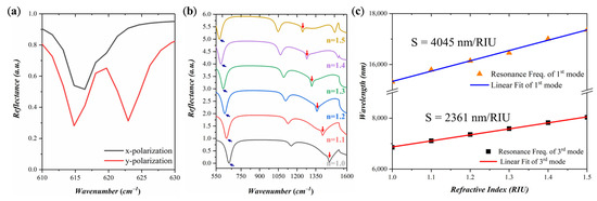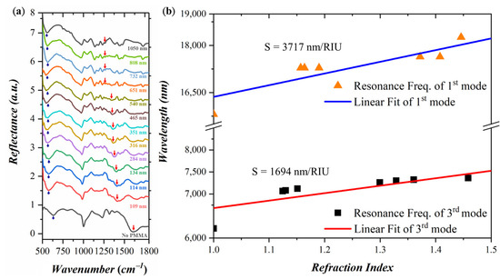 - Pryce, I.M.; Kelaita, Y.A.; Aydin, K.; Atwater, H.A. Compliant Metamaterials for Resonantly Enhanced Infrared Absorption Spectroscopy and Refractive Index Sensing. ACS Nano 2011, 5, 8167–8174. [Google Scholar] [CrossRef]