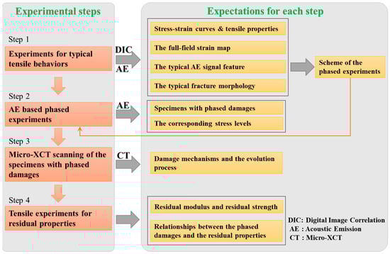 In this work, a four-step experimental procedure based on the phased approach is proposed to provide an experimental investigation on the effect of microcracks on the tensile properties of 3D woven composites. A combination of the aforementioned AE, DIC and micro-XCT was used to characterize the damage mechanisms, evolution process and residual performances. The four steps, with different expectations for each step, are shown in Figure 2. The first step was to carry out the tensile experiments of 3D woven composites, using an Instron 5890 test machine (Norwood, MA, USA) with a 250 kN load cell, to obtain the homogenized tensile modulus, tensile strength and elongation at break. The typical tensile behaviors were also characterized from multi-perspectives using stress–strain curves, the full-field strain evolution process, the AE signal features and the fracture morphologies. Experimental setups with a DIC system and an AE system are shown in Figure 3. A load rate of 2 mm/min was used in all tests. The homogenized modulus was calculated using the strain range from 1000 to 3000 με. Contrastive analysis of the typical AE energy curves against the load curves was performed to determine the scheme of the phased experiments, which was the foundation of the second step. Combining the AE energy curves with the load curves, one can tell the exact damage initiation time, evolution process and the influence of the damage on the instantaneous tensile mechanical responses.