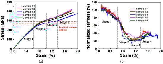 Typical tensile stress–strain curves of 3D woven composites in warp direction generated from the first step show a classical bilinear response and material softening, as shown in Figure 4a. The stress data were obtained using the load from the test machine divided by the cross-sectional area of each specimen, while the strain data were acquired from the DIC system using a calculating region, shown in Figure 5a. The typical stress–strain curves can be divided into four stages according to different mechanical behaviors. Stage 1 represents a linear process at the early part of the tensile tests with a strain range from 0.0% to 0.65%. The tensile modulus calculated using strain range of 0.1%–0.3% is shown in Table 2, with coefficients of variation (CoV) for the tensile modulus, the tensile strength and the elongation at break being 2.97%, 3.95% and 4.95%, respectively. The normalized stiffness–strain curves are shown in Figure 4b. Within the strain interval of 0.1%–0.3%, the normalized stiffness stays stable and then decreases slowly as the strain increases. An inflection point, as shown in Figure 4a, follows thereafter, at the strain level of 0.8%, which was classified into Stage 2. As shown in Figure 4b, the initial damages gave rise to a fast stiffness degradation of the tensile specimens during Stage 2. In Stage 3, the tangent tensile modulus intends to stay at a relatively stable value, which is obviously lower than the value in Stage 1. The phenomenon that appears in Stage 4 has never been reported in previous studies, showing a slight increase of the normalized stiffness after the plateau. According to the micro-XCT scanning results, shown in Section 3.3, the cracks induced by the tensile stress in Stage 4 give the warp yarns a certain deformation space, making the warp yarns straighter than their initiate state, leading to an increase in the normalized stiffness. The elongation at break and tensile strength of the specimens are shown in Table 2, both with a satisfying CoV of 3.95% and 6.45%, respectively.